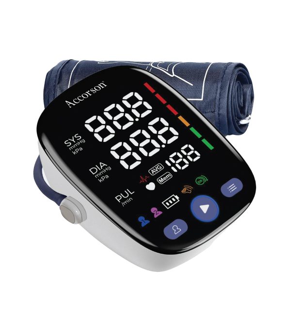 The Accorson FC-BP103 sets a new standard for home blood pressure monitoring, seamlessly blending advanced technology with effortless operation. The device is designed to be highly accessible, beginning with Easy 1-Touch Operation—a single press is all it takes to start the measurement process, simplifying use for all age groups. Readings are presented on a large, high-contrast Backlit Screen, ensuring clarity and visibility even in dimly lit environments, while the Time & Date Display ensures every record is properly timestamped.