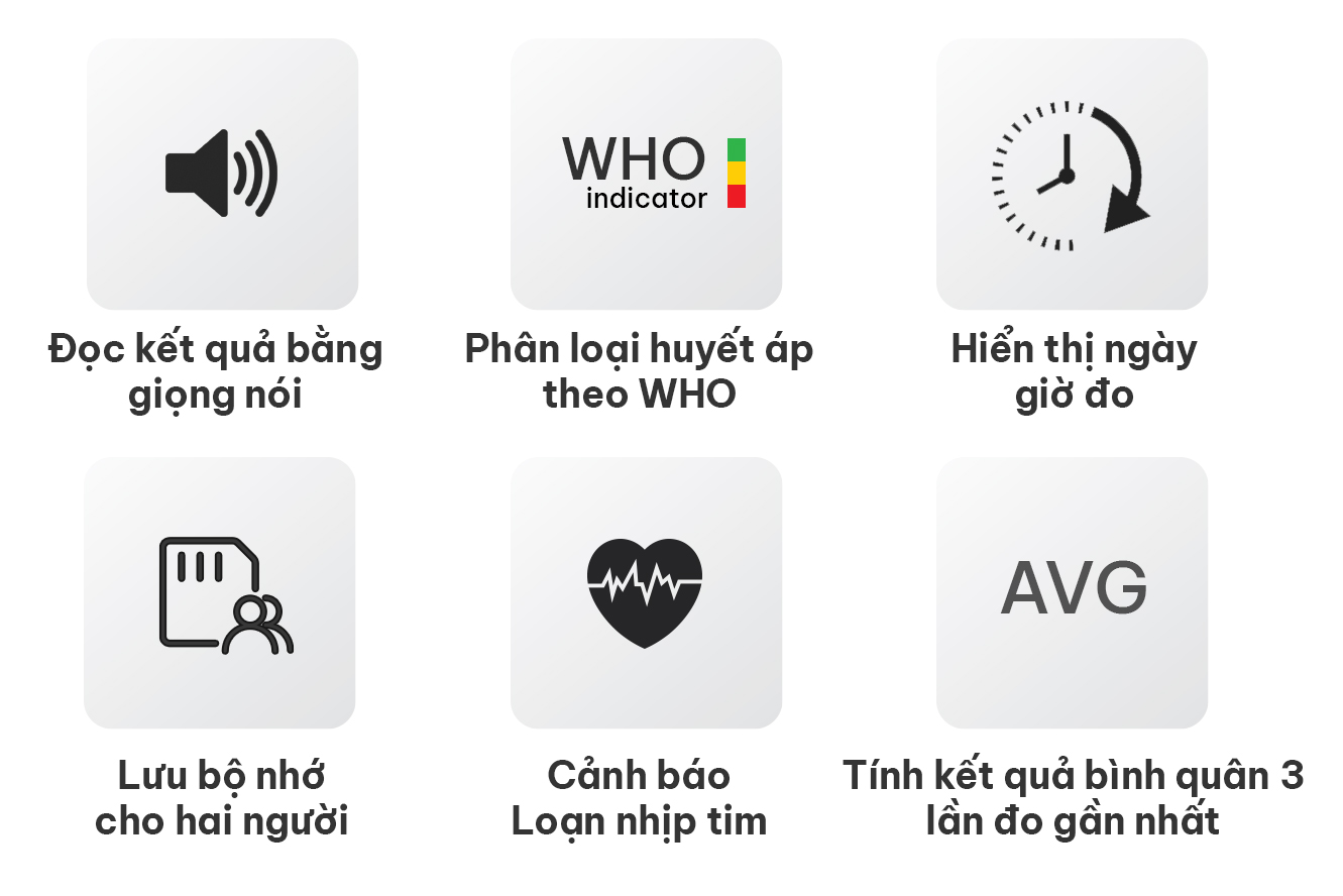 Máy đo huyết áp tiên tiến này được trang bị nhiều tính năng giúp việc theo dõi sức khỏe tại nhà trở nên dễ dàng, chính xác và thuận tiện. Một trong những điểm nổi bật là chức năng phát giọng nói (Voice Broadcast), giúp đọc to kết quả đo – đặc biệt hữu ích cho người cao tuổi hoặc người khiếm thị. Sau khi đo, kết quả sẽ được đánh giá ngay bằng chỉ báo Phân loại huyết áp theo tiêu chuẩn WHO (WHO Blood Pressure Classification). Tính năng này sử dụng hệ thống mã màu đơn giản (xanh, vàng, đỏ) để phân loại mức huyết áp theo chuẩn Tổ chức Y tế Thế giới, giúp người dùng dễ dàng nhận biết tình trạng của mình.
