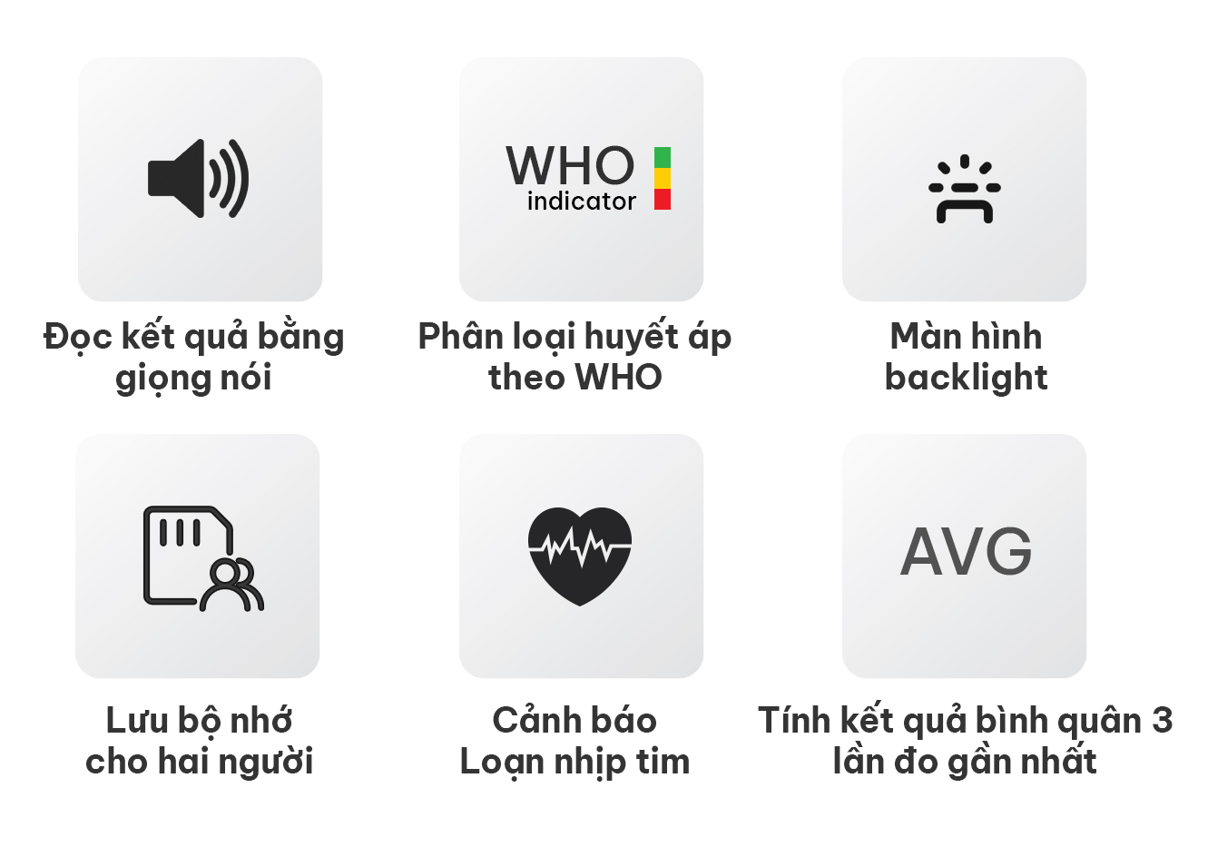 Để người dùng dễ dàng tự đánh giá tình trạng sức khỏe, thiết bị sử dụng chỉ báo phân loại huyết áp theo chuẩn WHO (WHO Blood Pressure Classification), hiển thị trạng thái kết quả dưới dạng mã màu theo tiêu chuẩn quốc tế.
